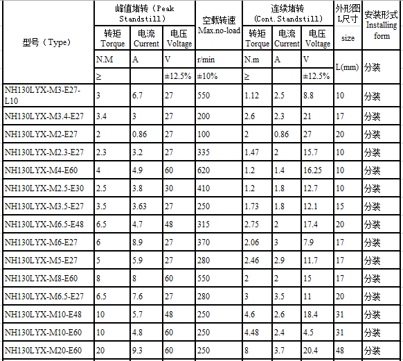 NH130LYX series brushless torque motor performance indicators
